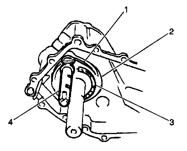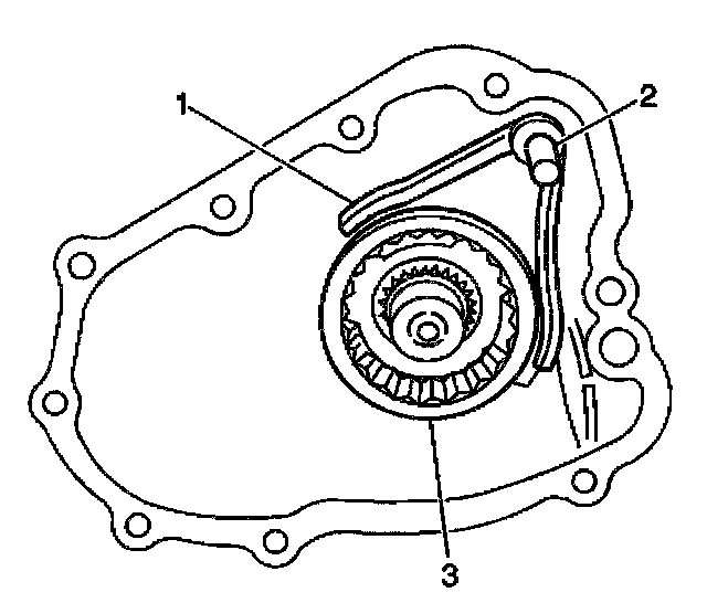 24. Install the interlock ball (1) into the center case passage. Push against the interlock notch of the front drive shift shaft (2).