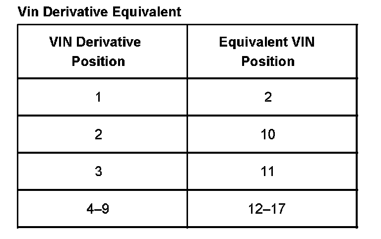 All engines and transmissions are stamped or laser etched with a partial Vehicle Identification Number (VIN), which was derived from the complete VIN. A VIN derivative contains the following nine positions.