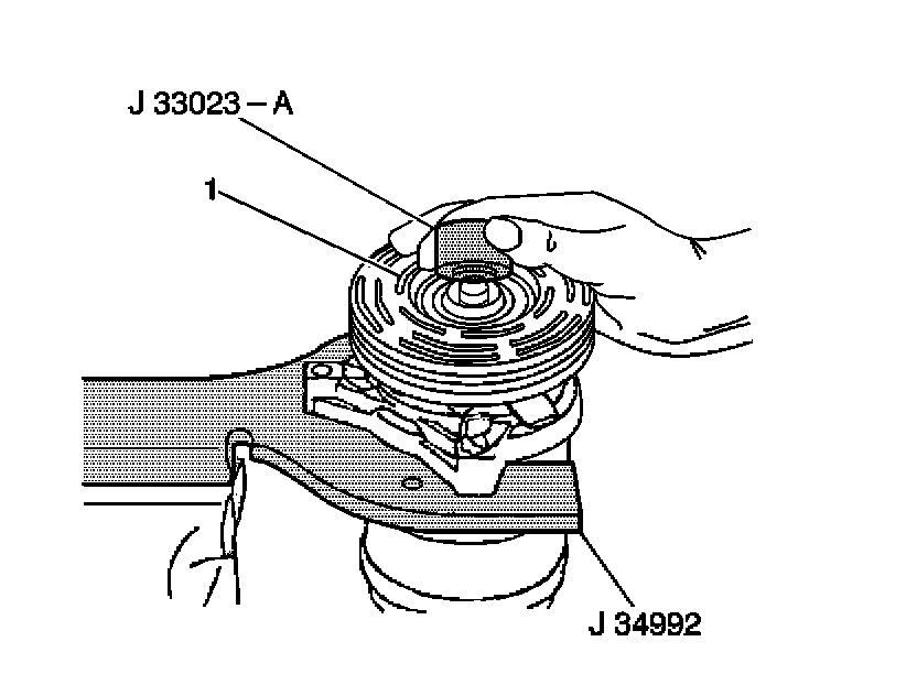 3. Place the J 33024 over the internal opening of the clutch coil housing (1).