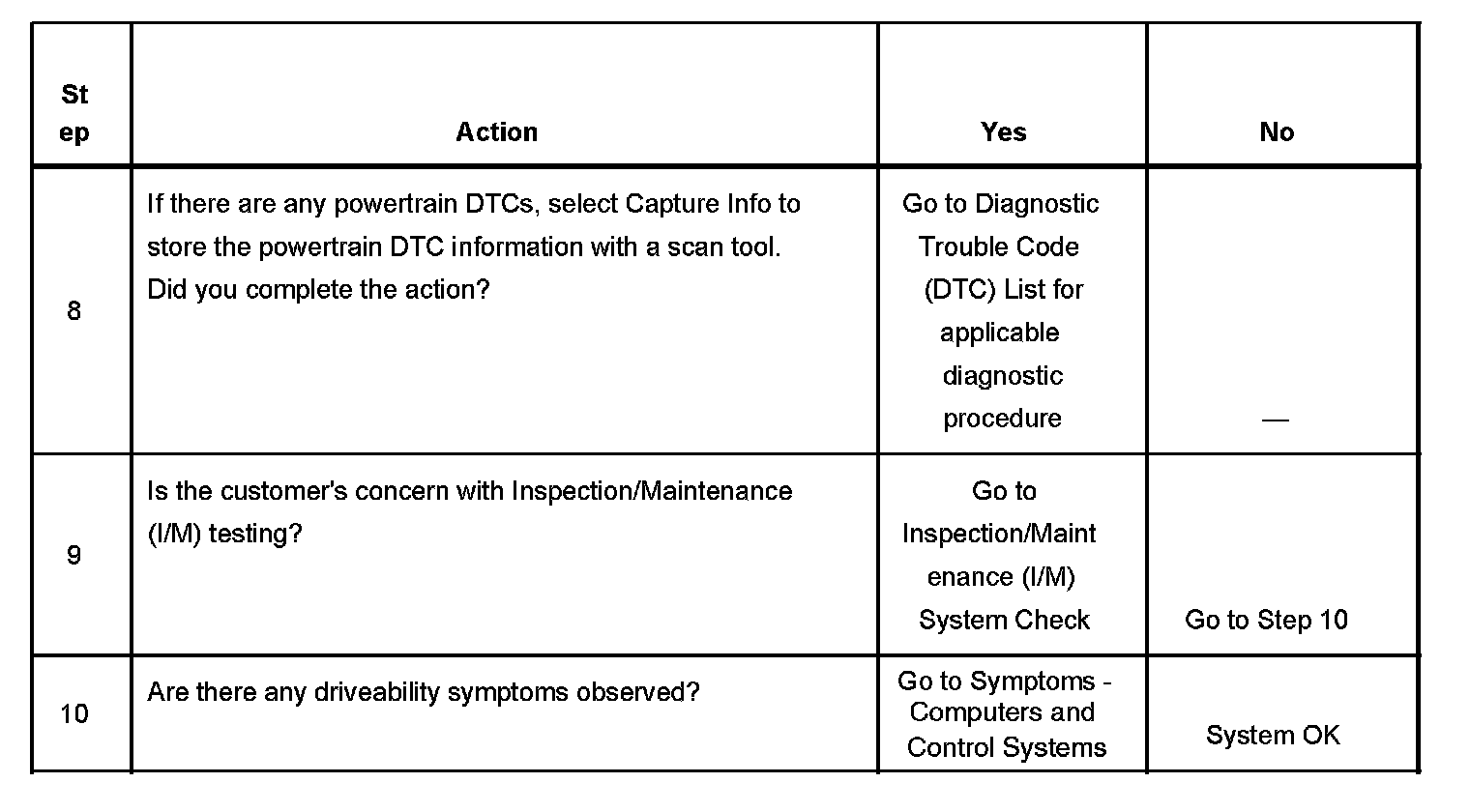 The Diagnostic System Check is an organized approach to identifying a condition created by an electronic engine control system malfunction. The Diagnostic System Check must be the starting point for any driveability concern. The Diagnostic System Check directs the service technician to the next logical step in diagnosing the concern. Understanding the table and using the table correctly reduces diagnostic time and prevents the replacement of good pans.