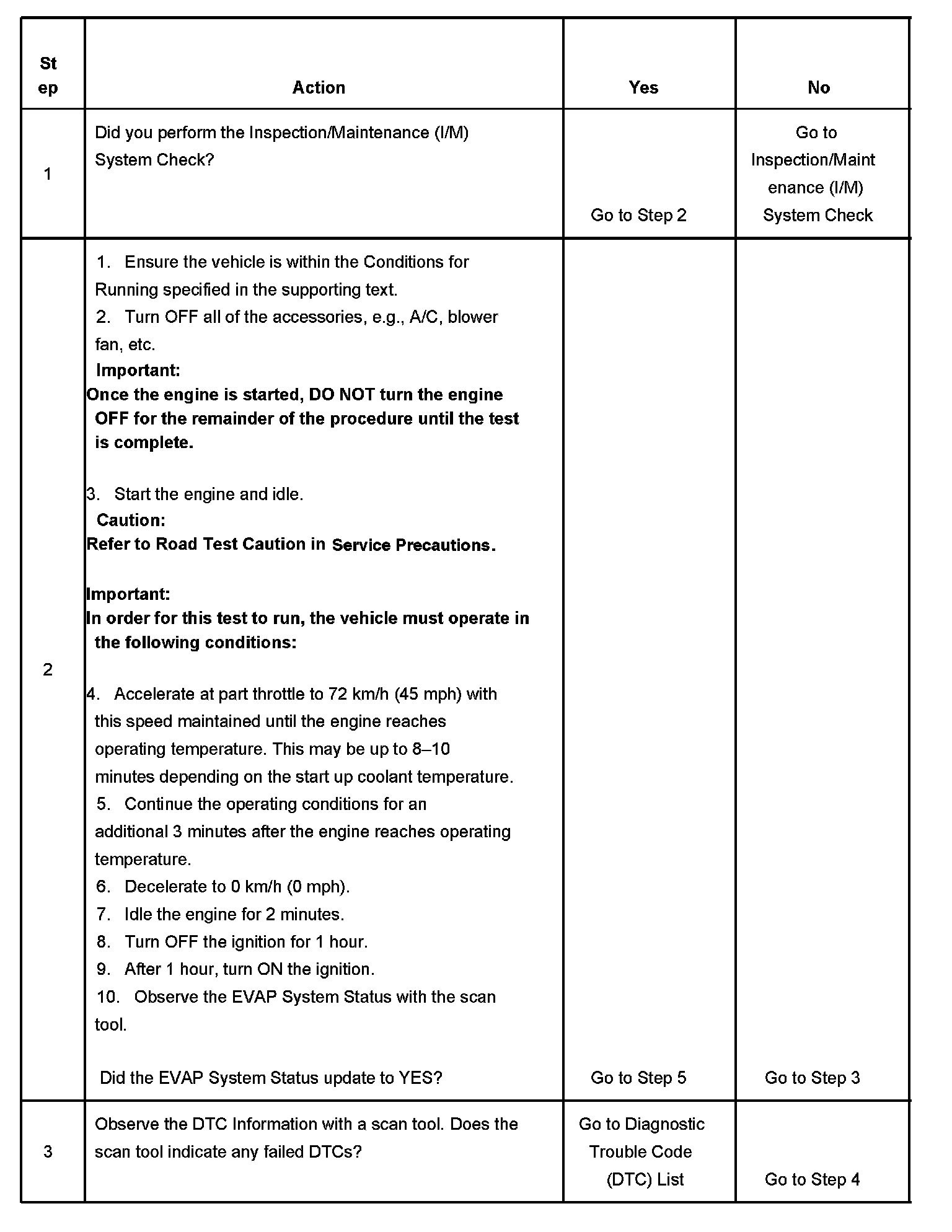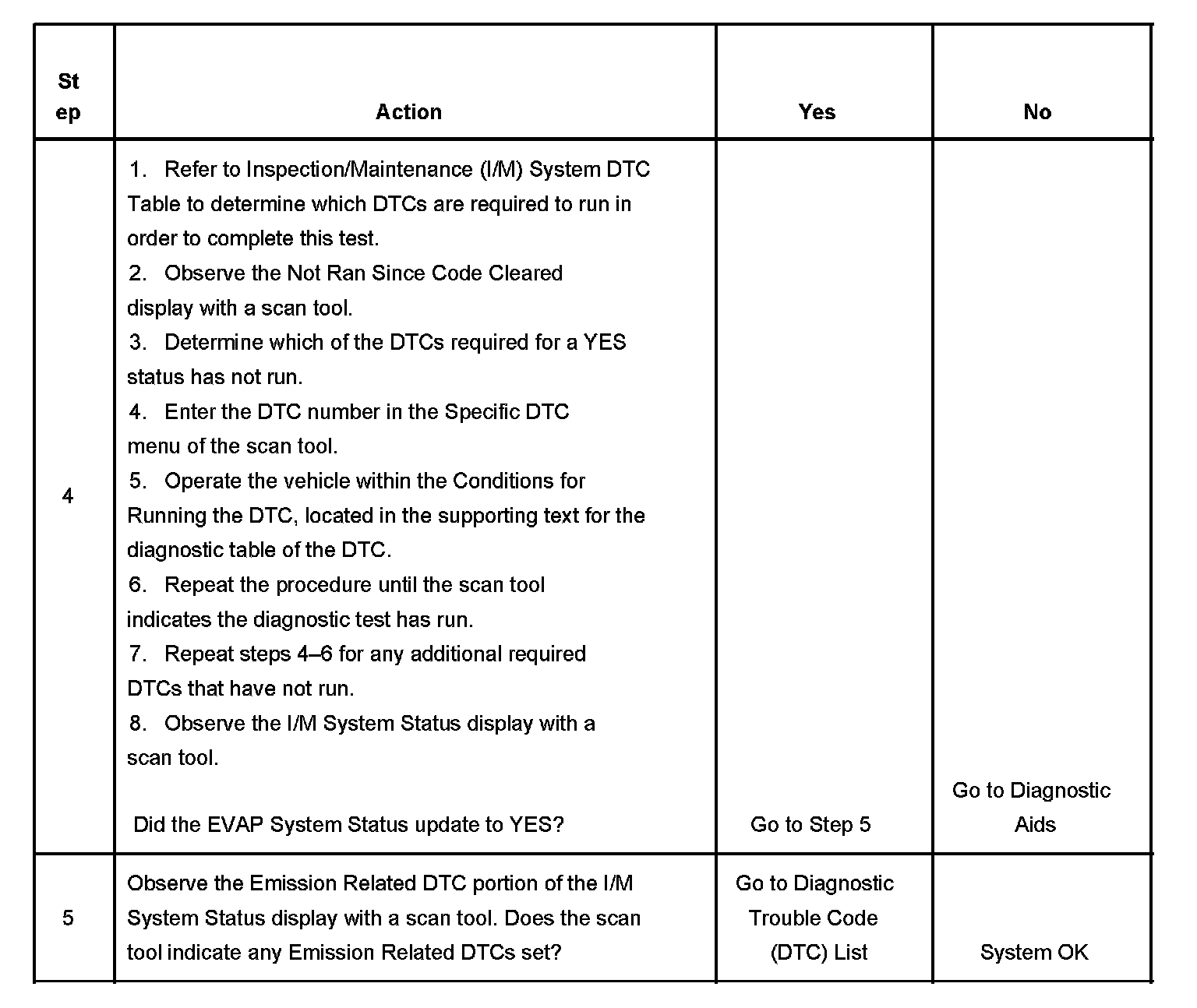 The purpose of this test is to satisfy the enable criteria necessary to execute I/M readiness diagnostics for the evaporative emission (EVAP) system. The test may be used to set the I/M System Status indicators to YES. The I/M System Status Display on the scan tool provides an indication of when the control module has completed the required tests. The I/M System Status does not indicate that the tests have passed or failed. When all of the diagnostics for a specific system have run and passed, the I/M System Status will update to YES. If a test for a specific system has failed, the I/M System Status will update to YES, indicating a determination was made, even if all of the other tests for that system have not run. Performing a visual inspection prior to running the EVAP test may prevent having to repeat the test. A failed or aborted test will require the vehicle to cool down in order to meet the enable criteria to run another test.