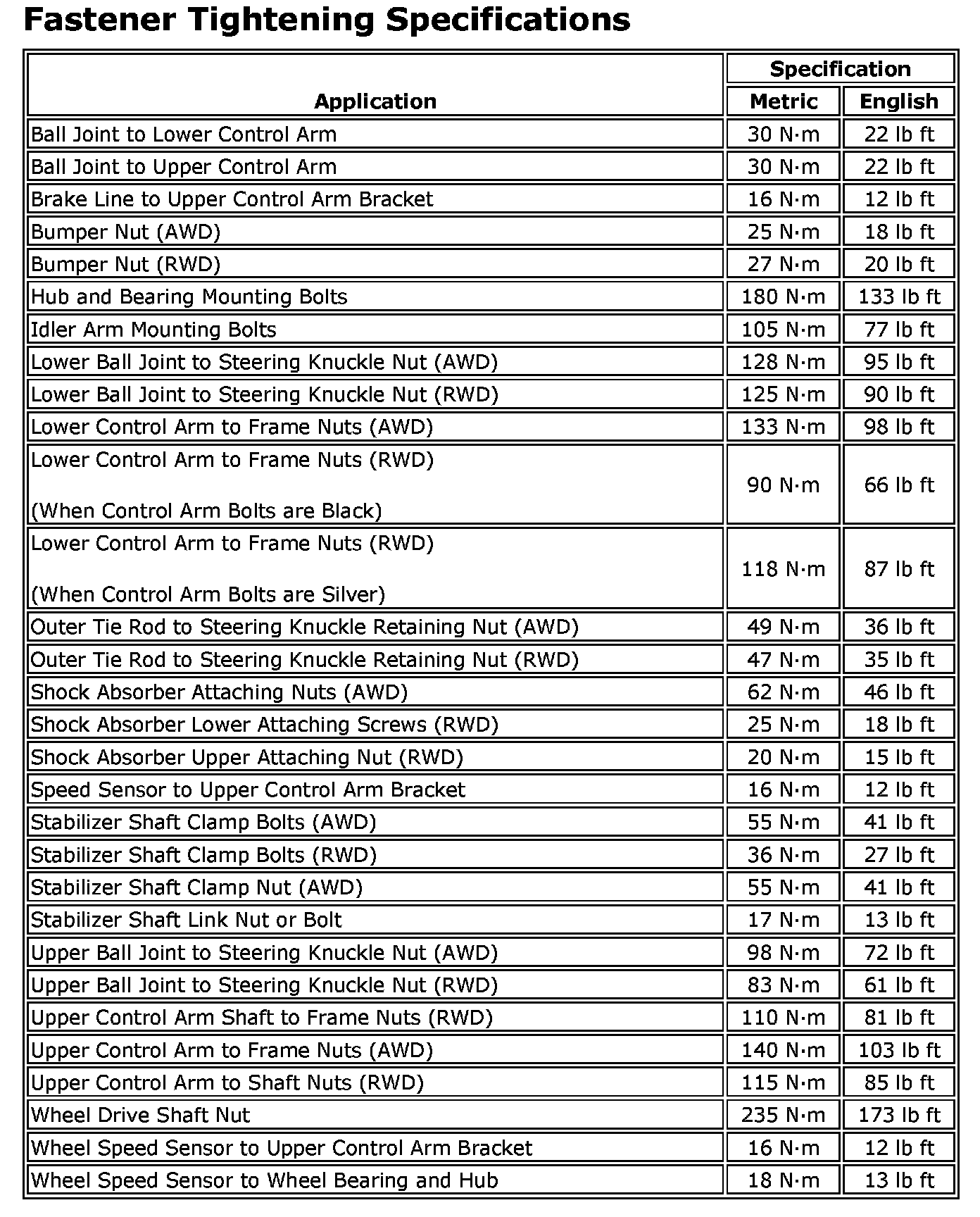 Fastener Tightening Specifications