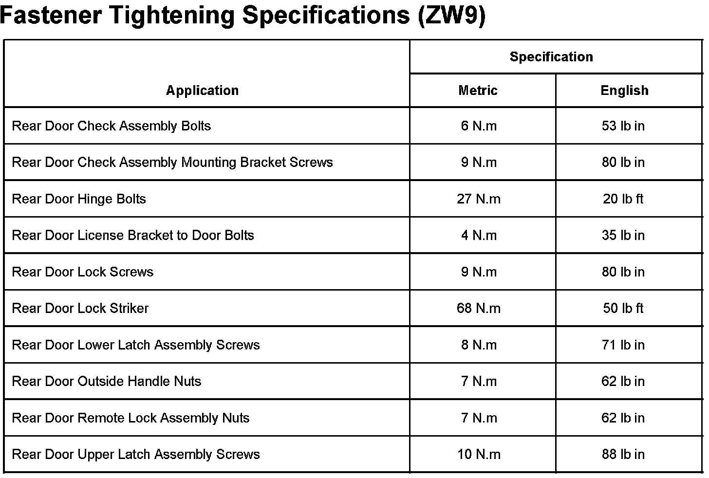Fastener Tightening Specifications (With RPO Code ZW9)