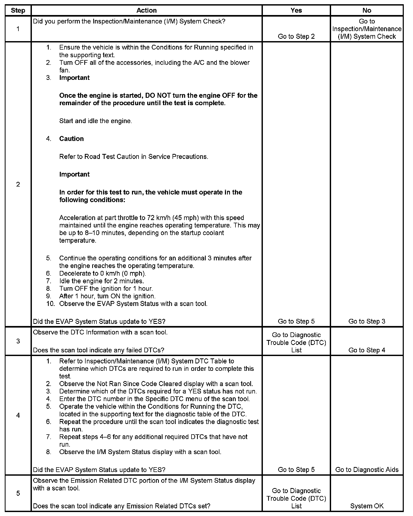 The purpose of this test is to satisfy the enable criteria necessary in order to execute the inspection/maintenance (I/M) readiness diagnostics for the evaporative emission (EVAP) system. The test may be used in order to set the I/M System Status indicators to YES. The I/M System Status Display on the scan tool provides an indication of when the control module has completed the required tests. The I/M System Status does not indicate that the tests have passed or failed. When all of the diagnostics for a specific system have run and passed and I/M System Status will update to YES. If a test for a specific system has failed, the I/M System Status will update to YES, indicating a determination was made, even if all of the other tests for that system have not run. Performing a visual inspection prior to running the EVAP test may prevent having to repeat the test. A failed or aborted test will require the vehicle to cool down in order to meet the enable criteria to run another test.