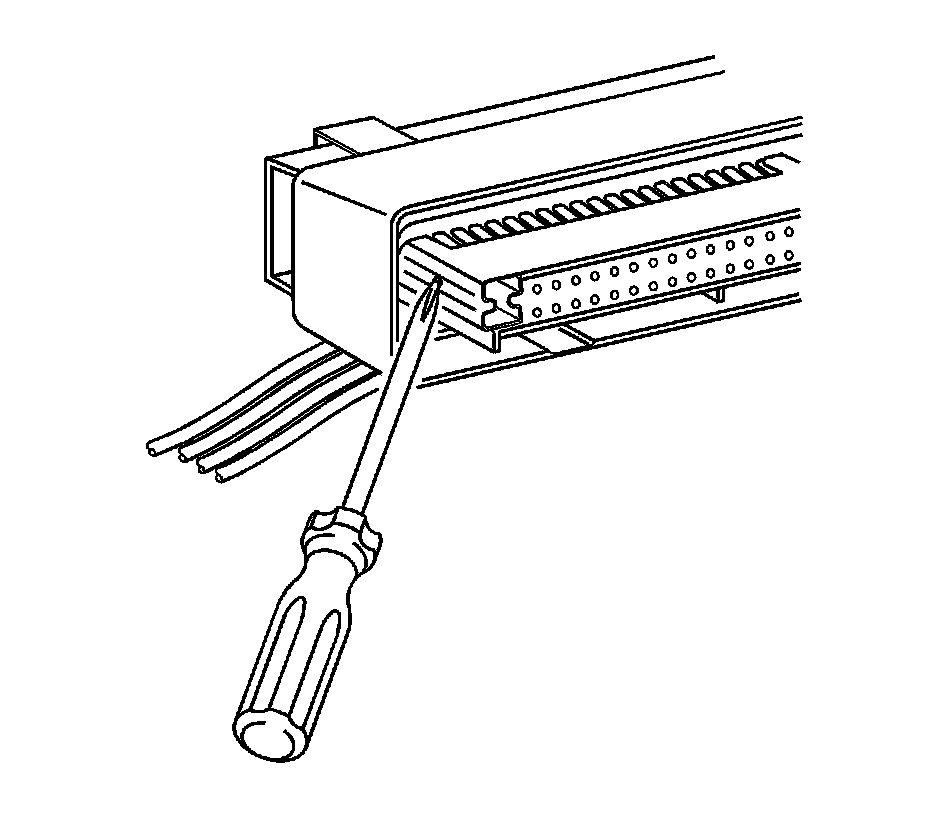 9. Use a small flat-bladed tool to gently lift the terminal retaining tab while gently pulling the wire out of the back of the Connector. Always remember never use force when pulling a terminal out of a Connector. If the terminal is severely bent or damaged, push the wire out of the front of the Connector instead of pulling it through. This will prevent damage to the internal seals of the Connector. Once the terminal is pushed out of the Connector, cut the wire as close to the terminal as possible and pull the wire through the Connector.