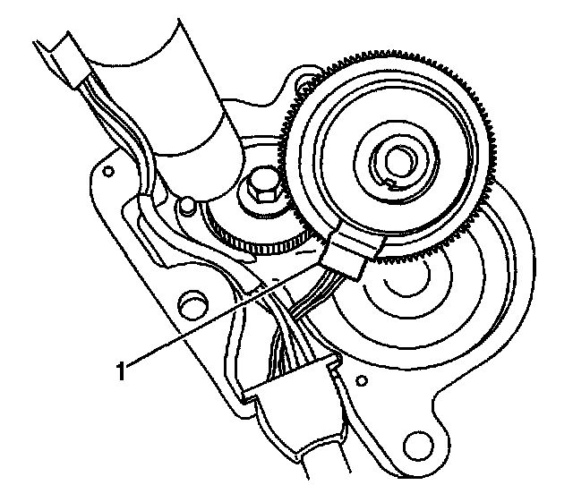 6. With the output gear/encoder assembly in hand, carefully align the casting and output gear timing marks (1).