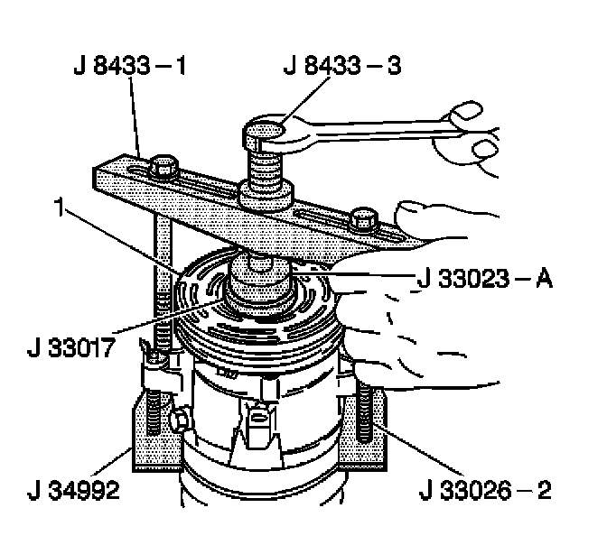 15. Tighten the center screw in the J 8433-1 in order to force the pulley rotor and bearing assembly onto the compressor front head. If the J 33017 slips off direct in-line contact with the inner race and bearing, perform the following steps: