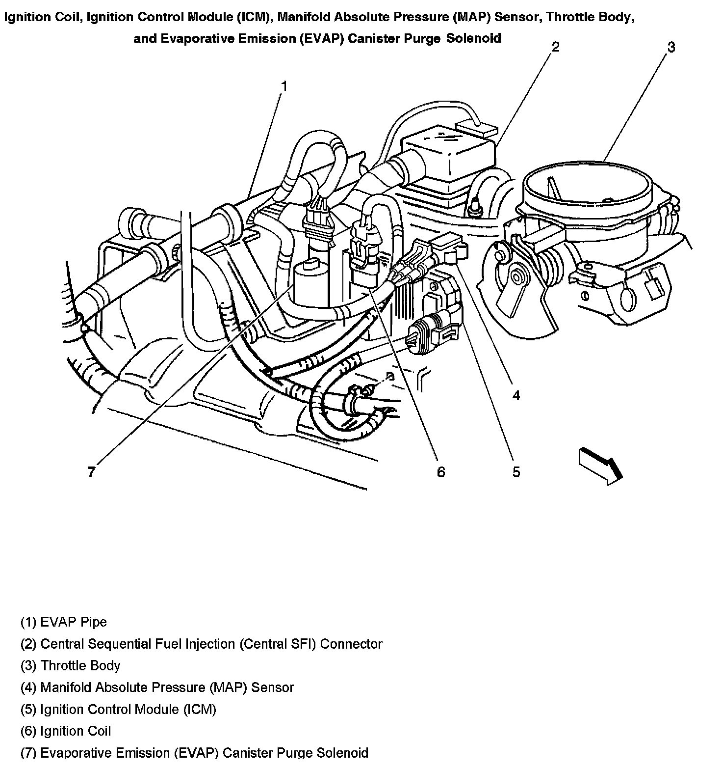 Ignition Coil, Ignition Control Module (ICM), Manifold Absolute Pressure (MAP) Sensor, Throttle Body, And Evaporative Emission (EVAP) Canister Purge Solenoid: