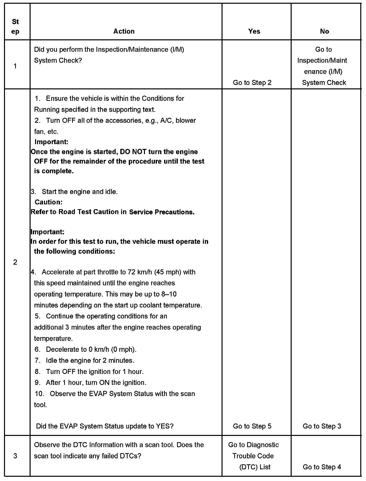 The purpose of this test is to satisfy the enable criteria necessary to execute I/M readiness diagnostics for the evaporative emission (EVAP) system. The test may be used to set the I/M System Status indicators to YES. The I/M System Status Display on the scan tool provides an indication of when the control module has completed the required tests. The I/M System Status does not indicate that the tests have passed or failed. When all of the diagnostics for a specific system have run and passed, the I/M System Status will update to YES. If a test for a specific system has failed, the I/M System Status will update to YES, indicating a determination was made, even if all of the other tests for that system have not run. Performing a visual inspection prior to running the EVAP test may prevent having to repeat the test. A failed or aborted test will require the vehicle to cool down in order to meet the enable criteria to run another test.