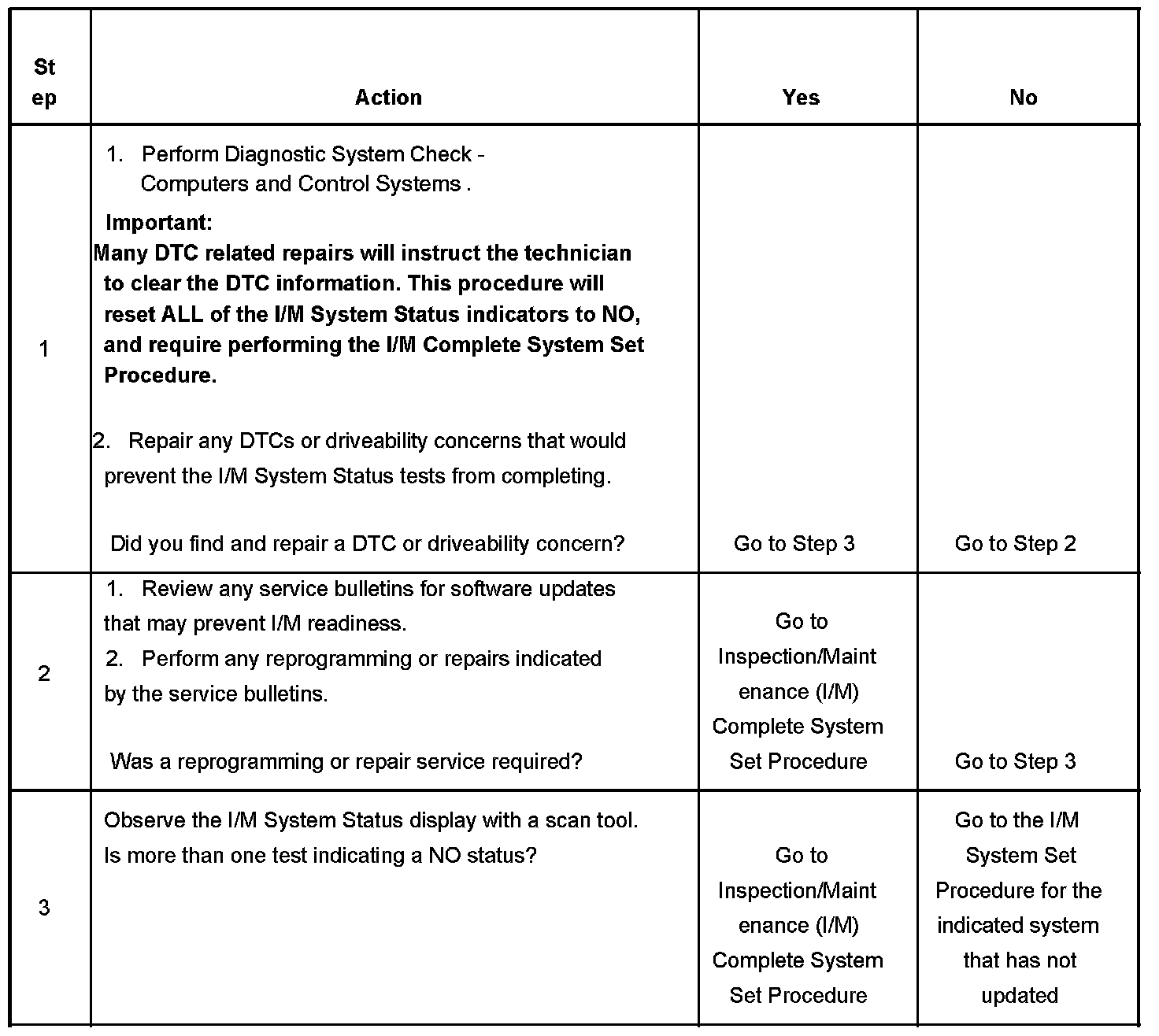 For example, when the HO2S Heater Status indicates YES, either all of the oxygen sensor heater tests have passed or one of the tests has illuminated the MIL. If the vehicle has four heated oxygen sensors, either all four heater circuit tests have passed or one of the heater circuit tests has illuminated the MIL. The I/M System Status will indicate NO under the Completed column when any of the required tests for that system have not run. The following is a list of conditions that would set the I/M System Status indicator to NO: