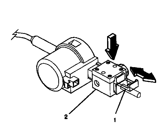 3.1. Pull out the tab (1) on the adjuster block side (2) of the automatic transmission shift lock control actuator.