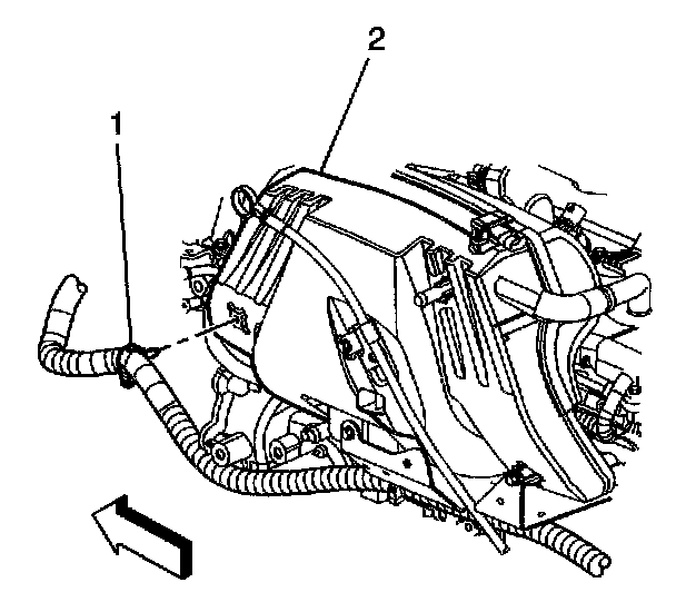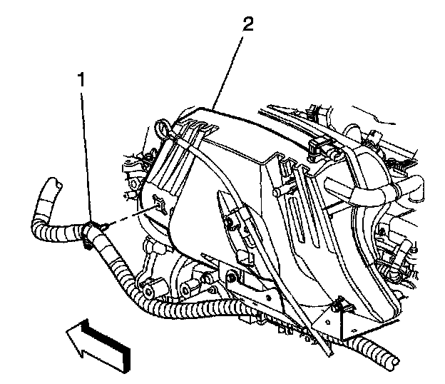 9. Disconnect the engine wiring harness retainer (1) from the intake manifold (2).