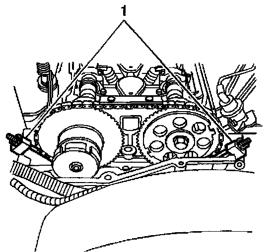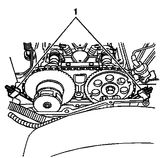 2. Install the exhaust camshaft actuator into the timing chain. Aligning the marked link (1) on the timing chain with the timing mark (1) on the exhaust camshaft position actuator sprocket.