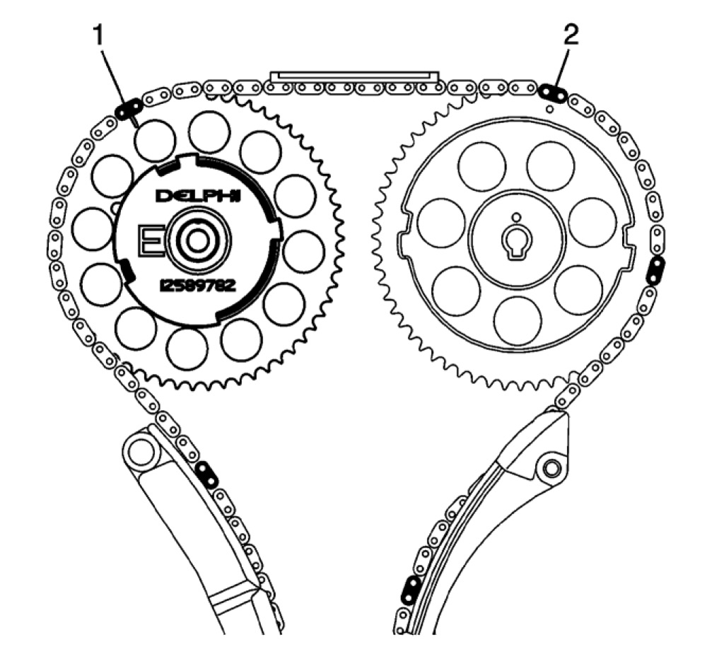 6. Once the timing is set, ensure there are 15 links between the exhaust timing mark (1) and the intake timing mark (2).