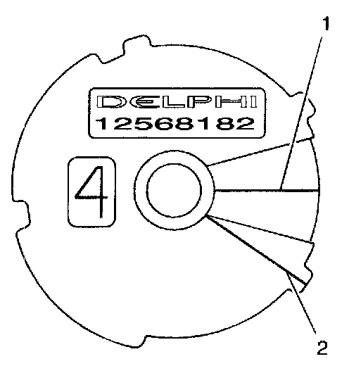 4. Scribe or draw a line (2) on the camshaft position actuator at that position.