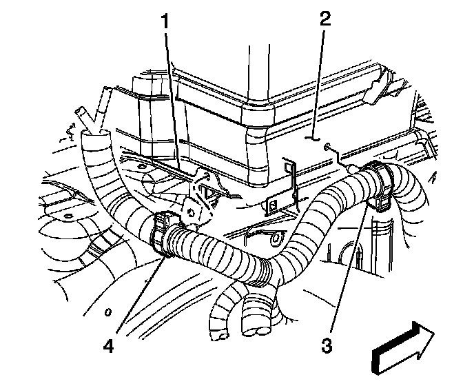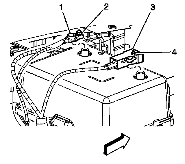 7. Remove the nut (3) securing the battery positive cable (4) to the underhood fuse block (1).
