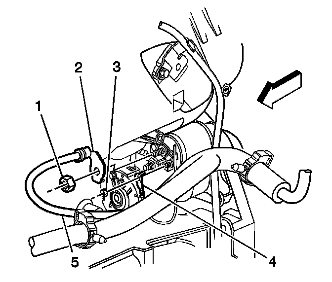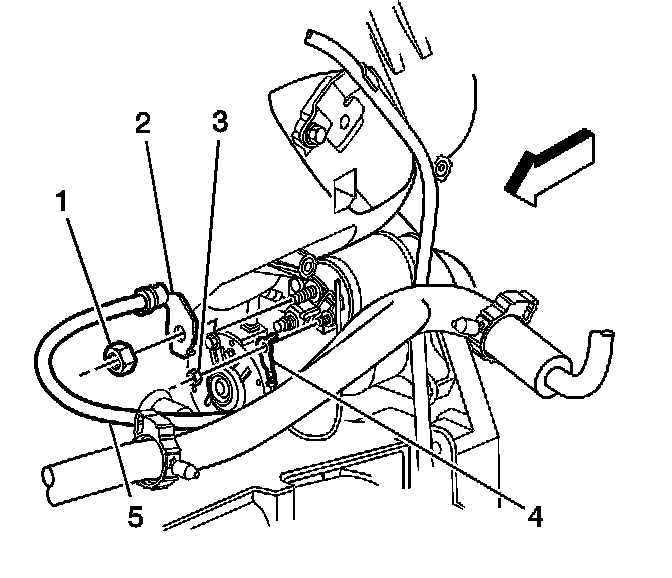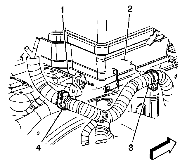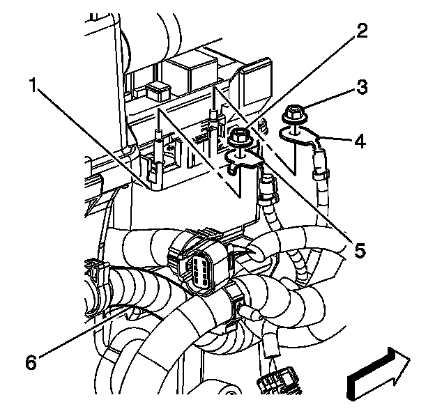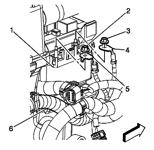 12. Open the battery cables harness retainer (5) at the engine wiring harness bracket (1).