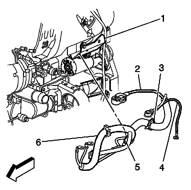 8. Remove the battery positive cable (4) from the upper portion of the battery cables harness conduit (6).
