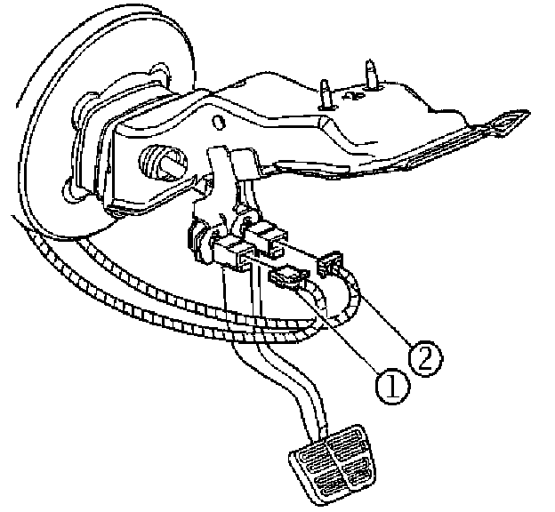There are two switches above the brake pedal - the cruise control switch (1) and the stop lamp switch (2). The cruise control switch is in the outboard position and the stop lamp switch is in the inboard position.
