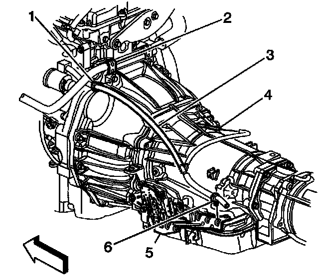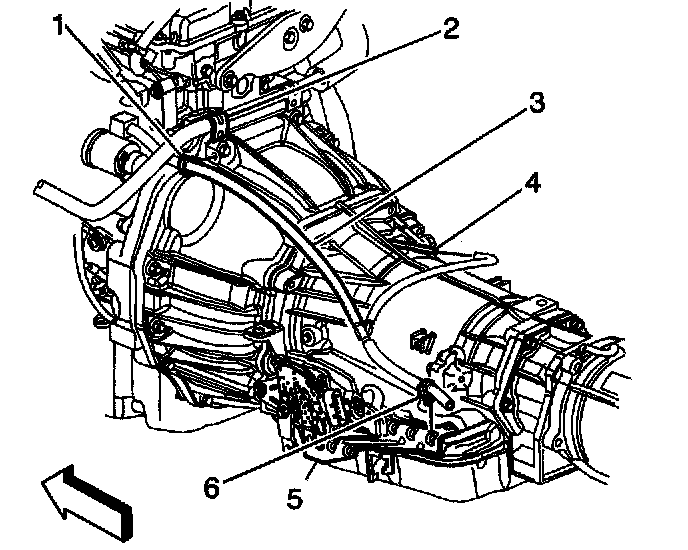 2. Disconnect the transmission vent hose retainer (1, 6) from the following: