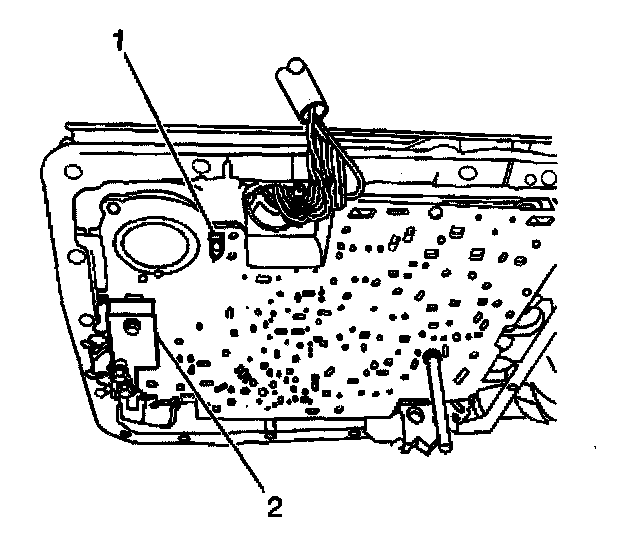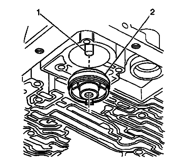 2. Install the 3-4 accumulator piston (2) onto the pin (1) in the transmission case. Ensure that the 3-4 accumulator piston legs face away from the transmission case.
