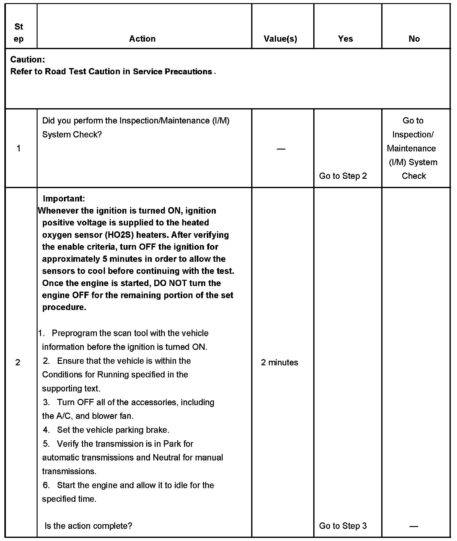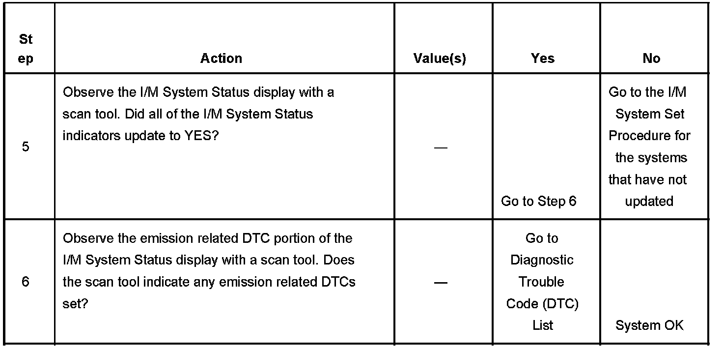 The scan tool can be used in order to monitor each of the I/M System Status indicators during the I/M Complete System Set Procedure. When all of the indicators for a test step have updated to YES, testing can move on to the next step even if the remaining portion of the test is not complete. For example, step 3 is designed to run the EVAP, AIR, and HO2S tests. The procedure instructs the technician to operate the vehicle in the enable conditions for 6 minutes. If all 3 tests have updated to YES within 4 minutes, you do not need to continue with the enable conditions and testing can advance to the next step.