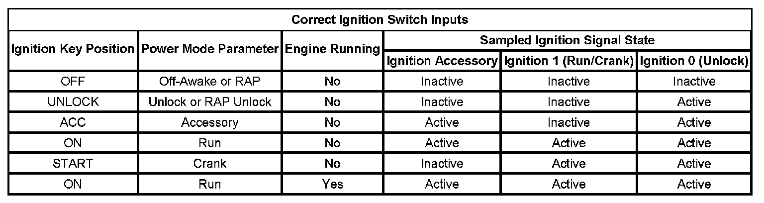 On vehicles that have several control modules connected by serial data circuits, one module is the power mode master (PMM). On this vehicle the PMM is the BCM. The BCM uses 3 signals from the ignition switch. These are the Ignition 0 (Unlock), Ignition 1 (Run/Crank), and Accessory.