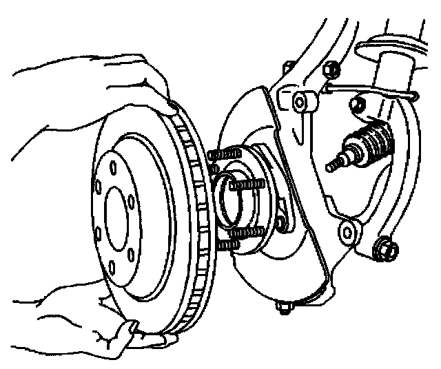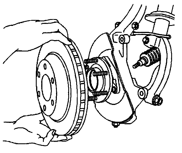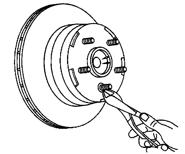 Important: If the brake rotor is not going to be replaced but just removed from the front hub, mark the relationship of the brake rotor and a wheel stud.