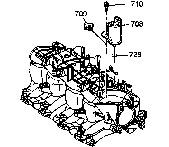 10. Remove the EVAP purge solenoid bolt (710), solenoid (708), and isolator (709) from the intake manifold.