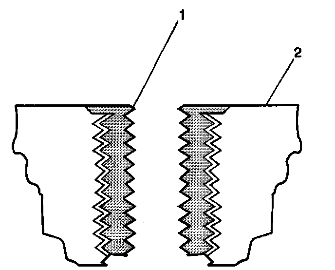 18. Apply threadlock LOCTITE Tm 277, J 42385-109 (1), or equivalent to the insert OD threads (2).