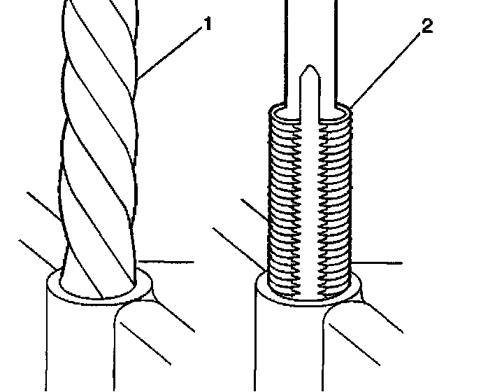 1. Drill out the threads of the damaged hole (1).