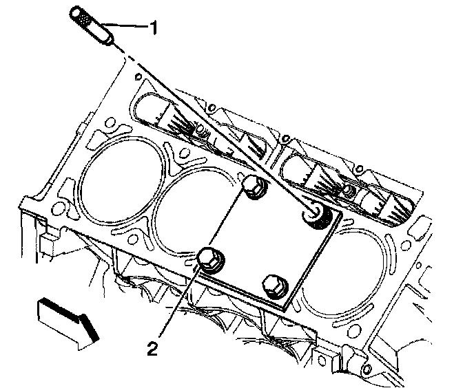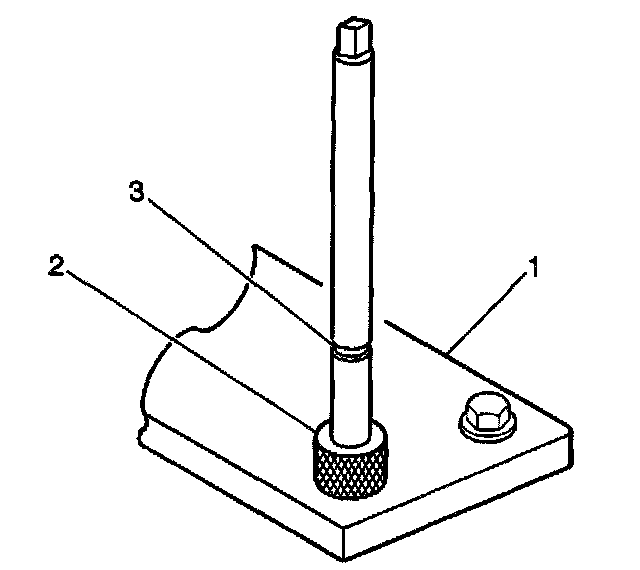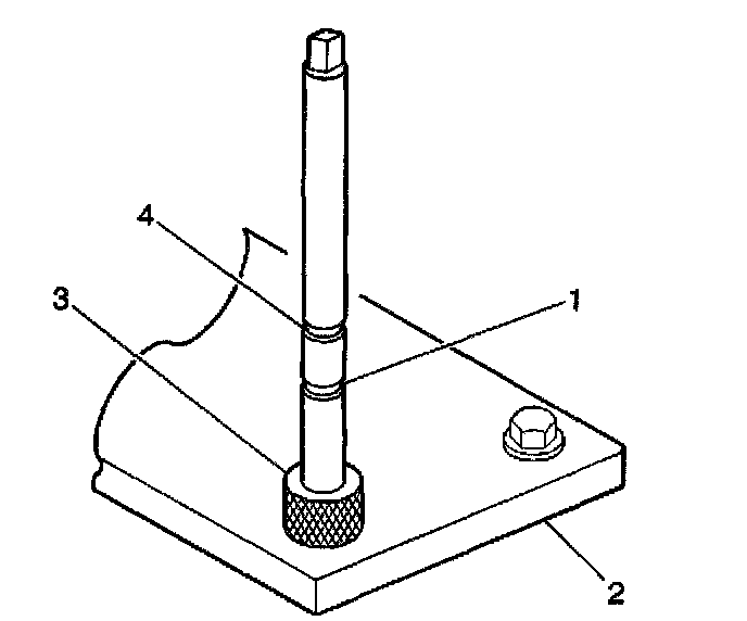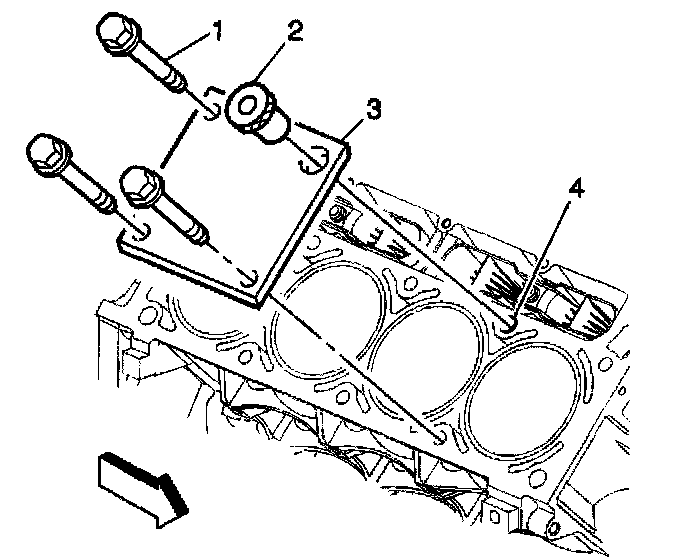 3. Install the fixture plate (3), bolts (1), and bushing (2) onto the engine block deck. Position the fixture plate and bushing over the hole that is to be repaired (4).