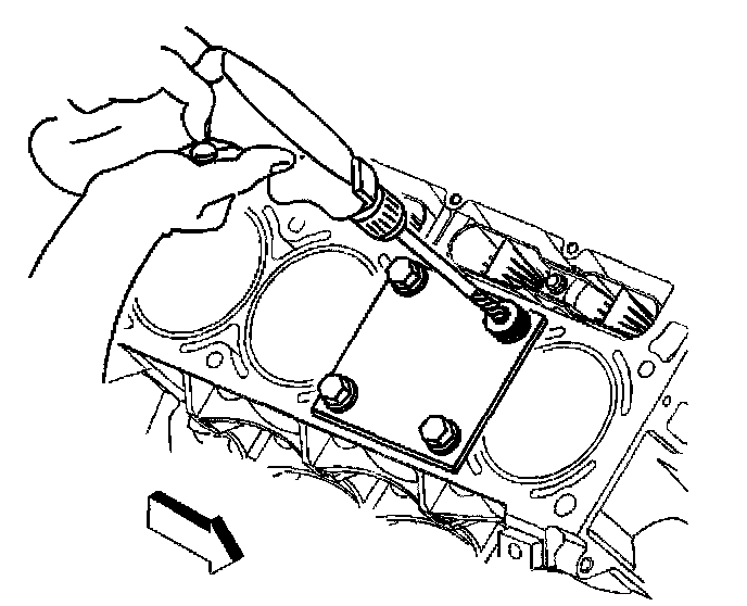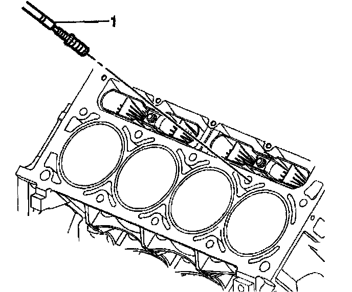 19. Install the insert and driver (1) into the hole. Rotate the driver tool until the mark on the tool aligns with the deck surface of the engine block.