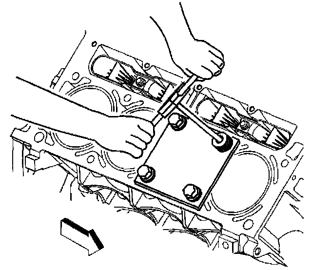 2. Install the fixture plate, bolt, and bushing, onto the engine block. Position the fixture plate and bushing over the hole that is to be repaired.