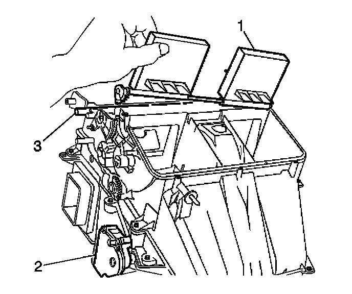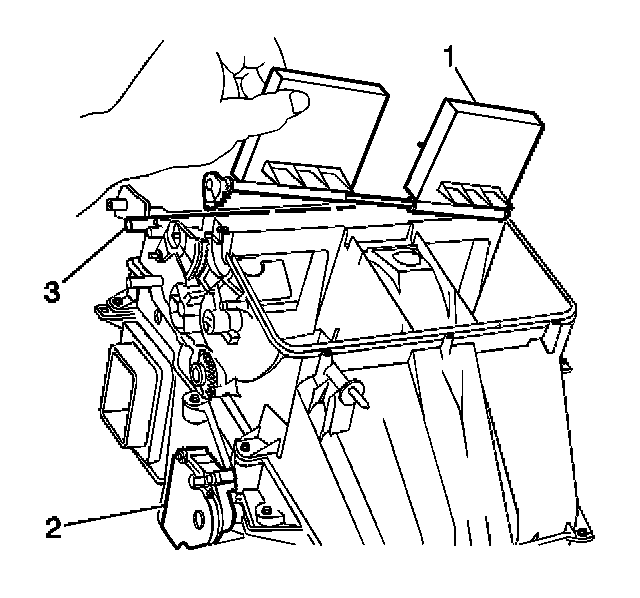 3. Install the defroster/mode outlet cover screws to the HVAC module assembly (1).