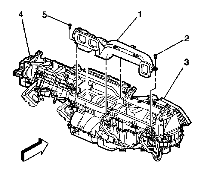 4. Remove the air distribution duct (5) from the HVAC module.