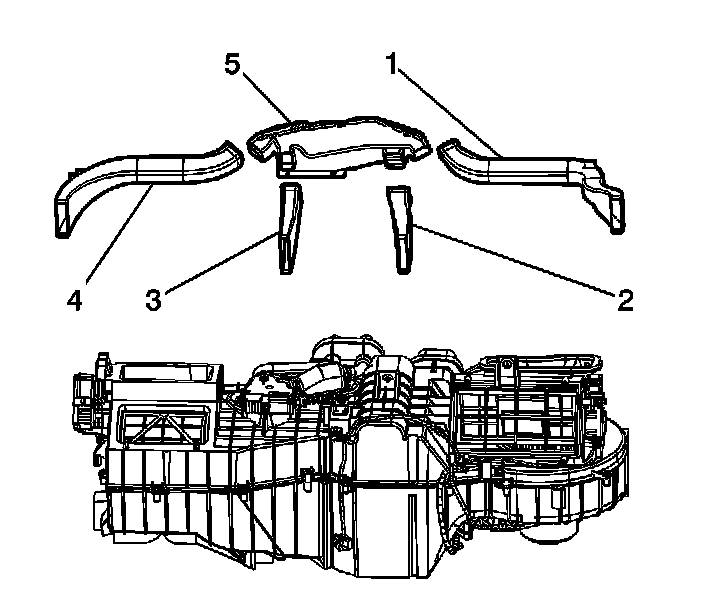 1. Install the air distributor duct (5) to the HVAC module (3) and press down to secure.