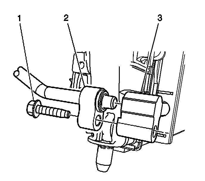4. Remove the A/C compressor hose assembly to A/C condenser fitting bolt (1).