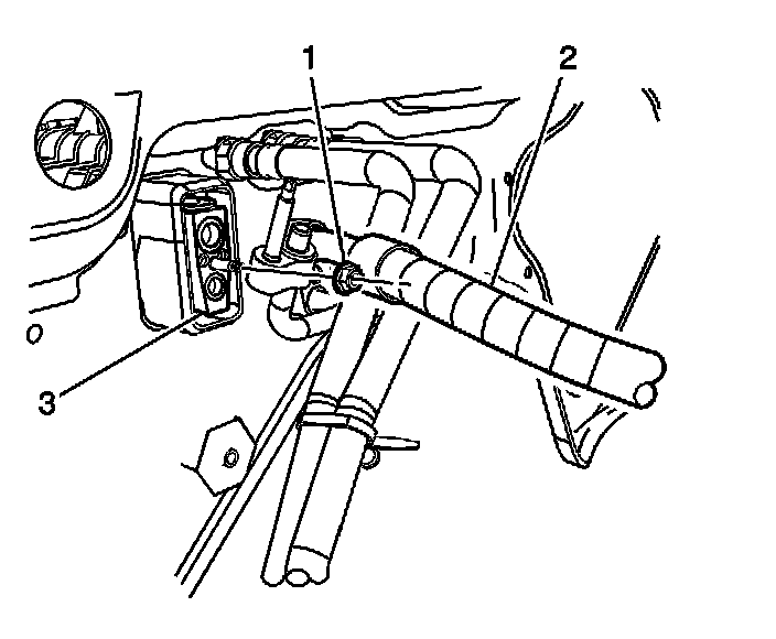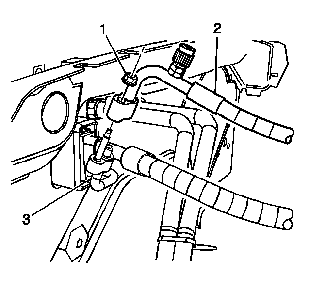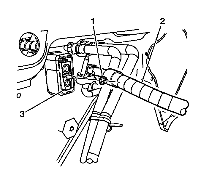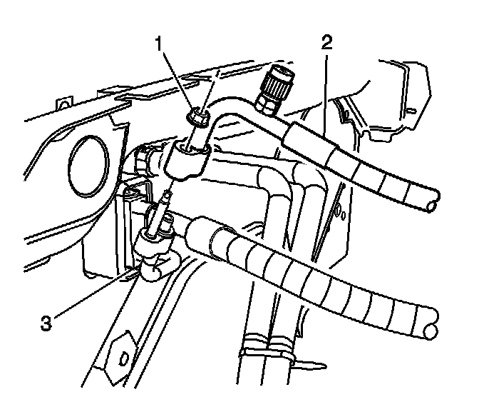 4. Remove the retaining nut (1) from the compressor hose (2) at the thermal expansion valve (TXV) (3).