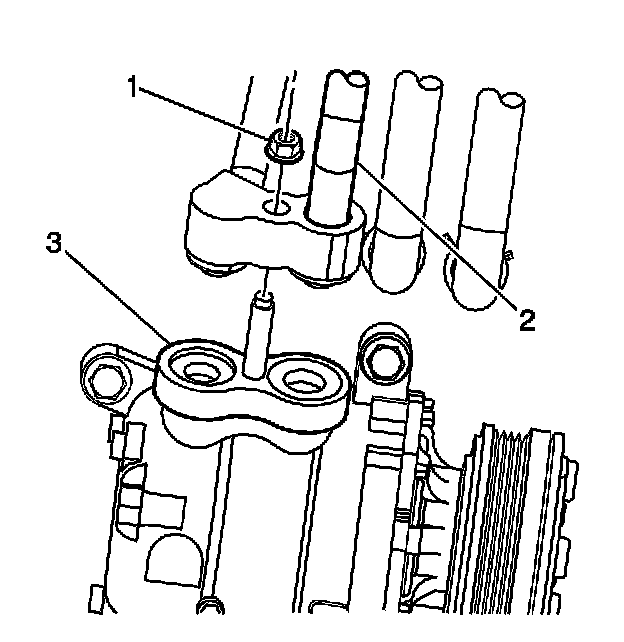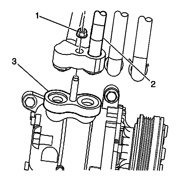 10. Remove the compressor hose mounting nut (1) from the A/C compressor (3).