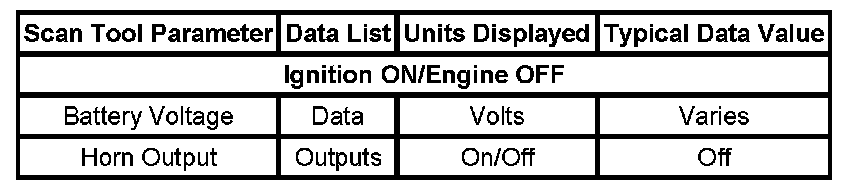 SCAN TOOL DATA LISTThe Horns Scan Tool Data List contains all of the horn related parameters that are available on the scan tool. The parameters in the list are arranged in alphabetical order. The column, "Data List," indicates the location of the parameter within the scan tool menu selections. Use the Horns Scan Tool Data List as directed by a diagnostic table or in order to supplement the diagnostic procedures. Begin all of the diagnostic procedures with Diagnostic System Check - Horns.