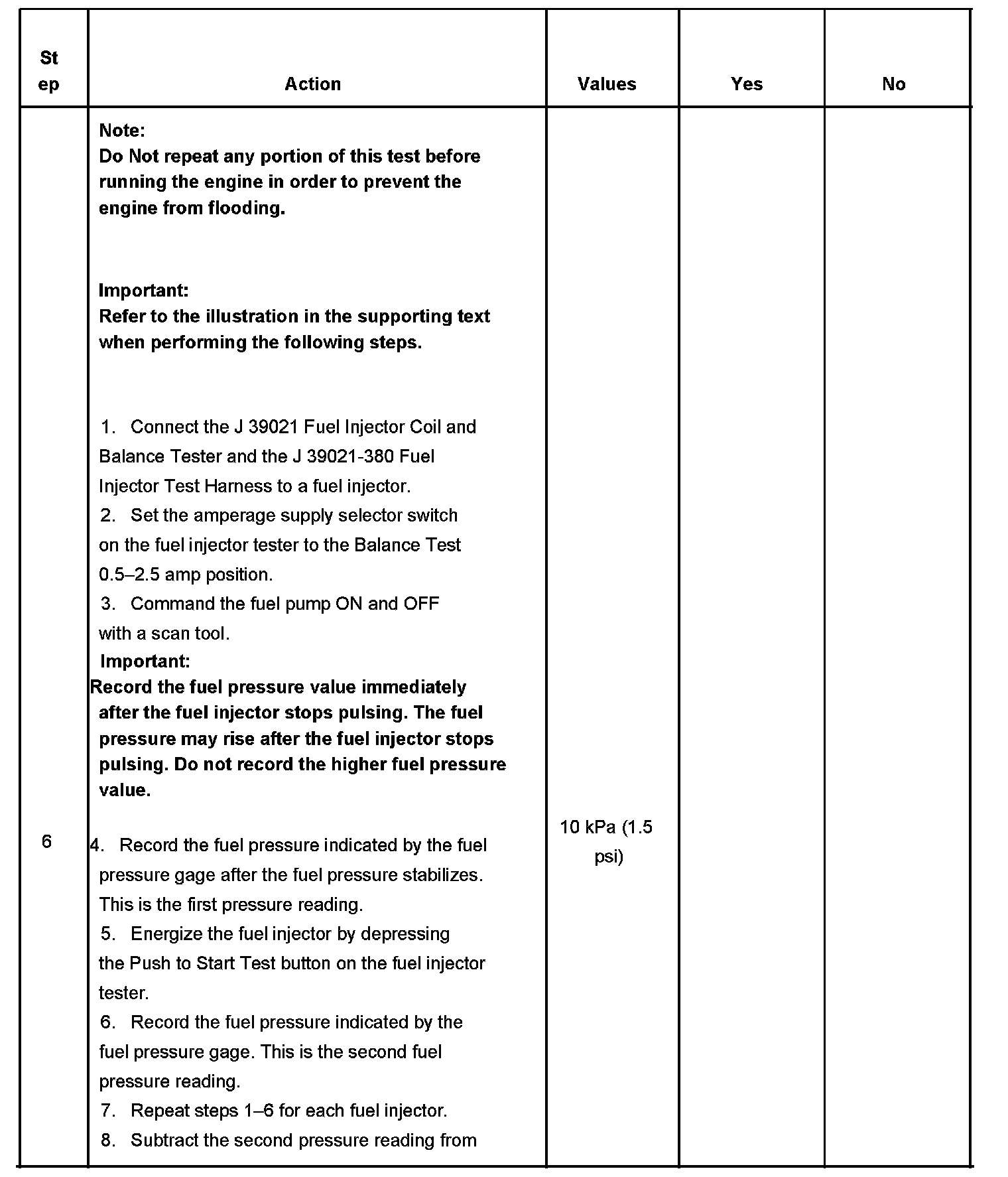 6. If the pressure drop value for each fuel injector is within 10 kPa (1.5 psi) of the average pressure drop value, the fuel injectors are flowing properly. Calculate the pressure drop value for each fuel injector by subtracting the second pressure reading from the first pressure reading. Refer to the illustration.
