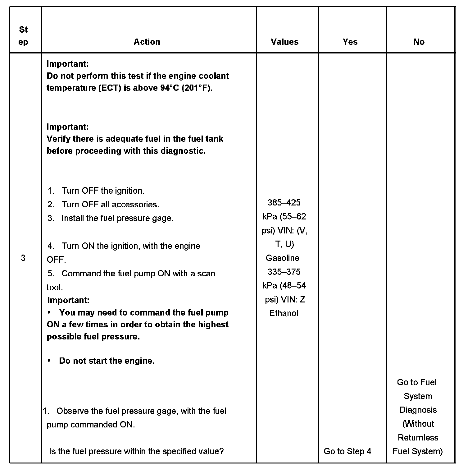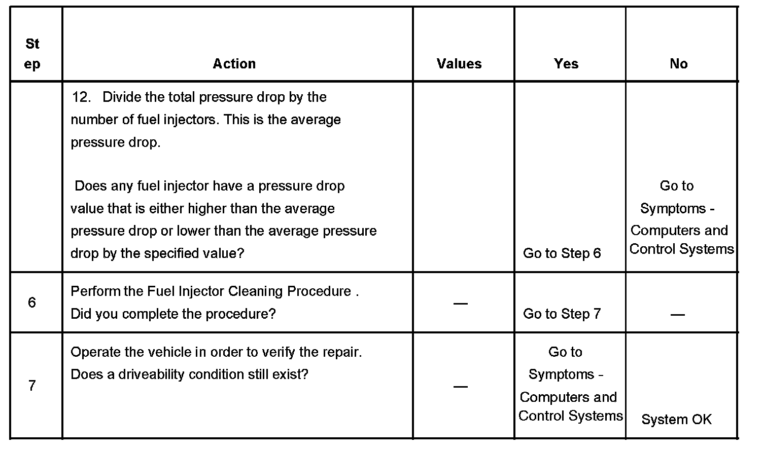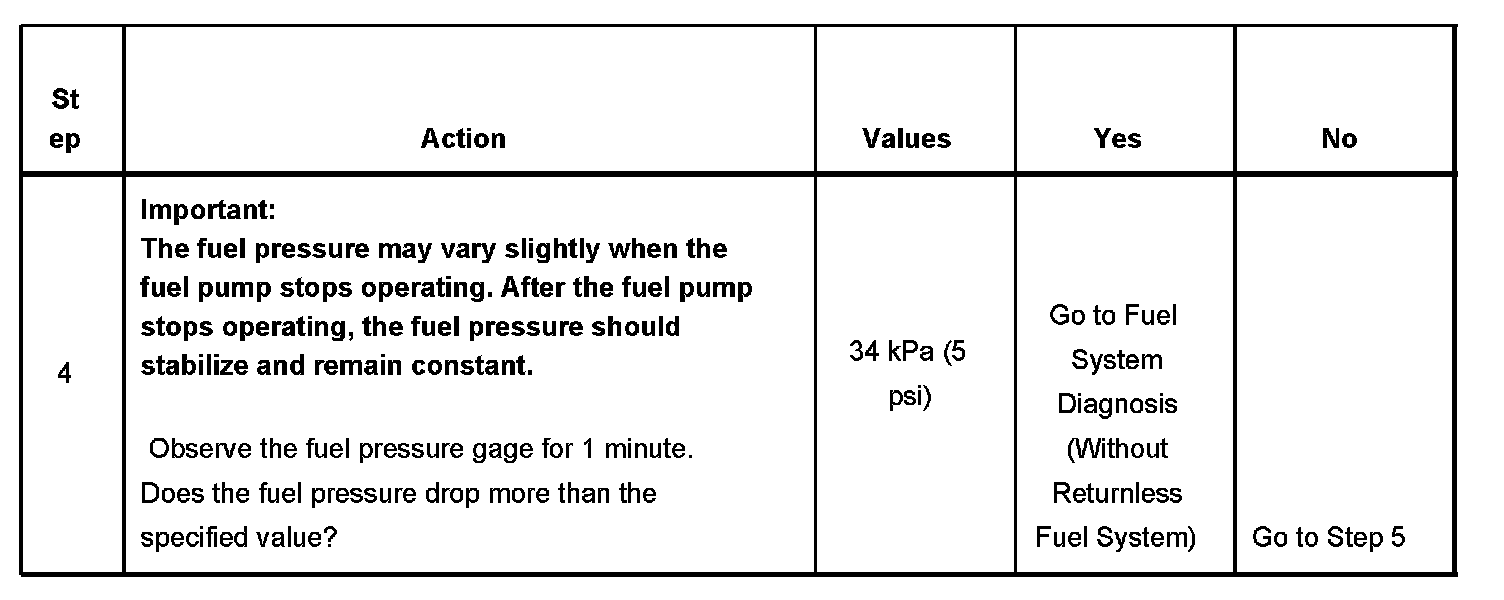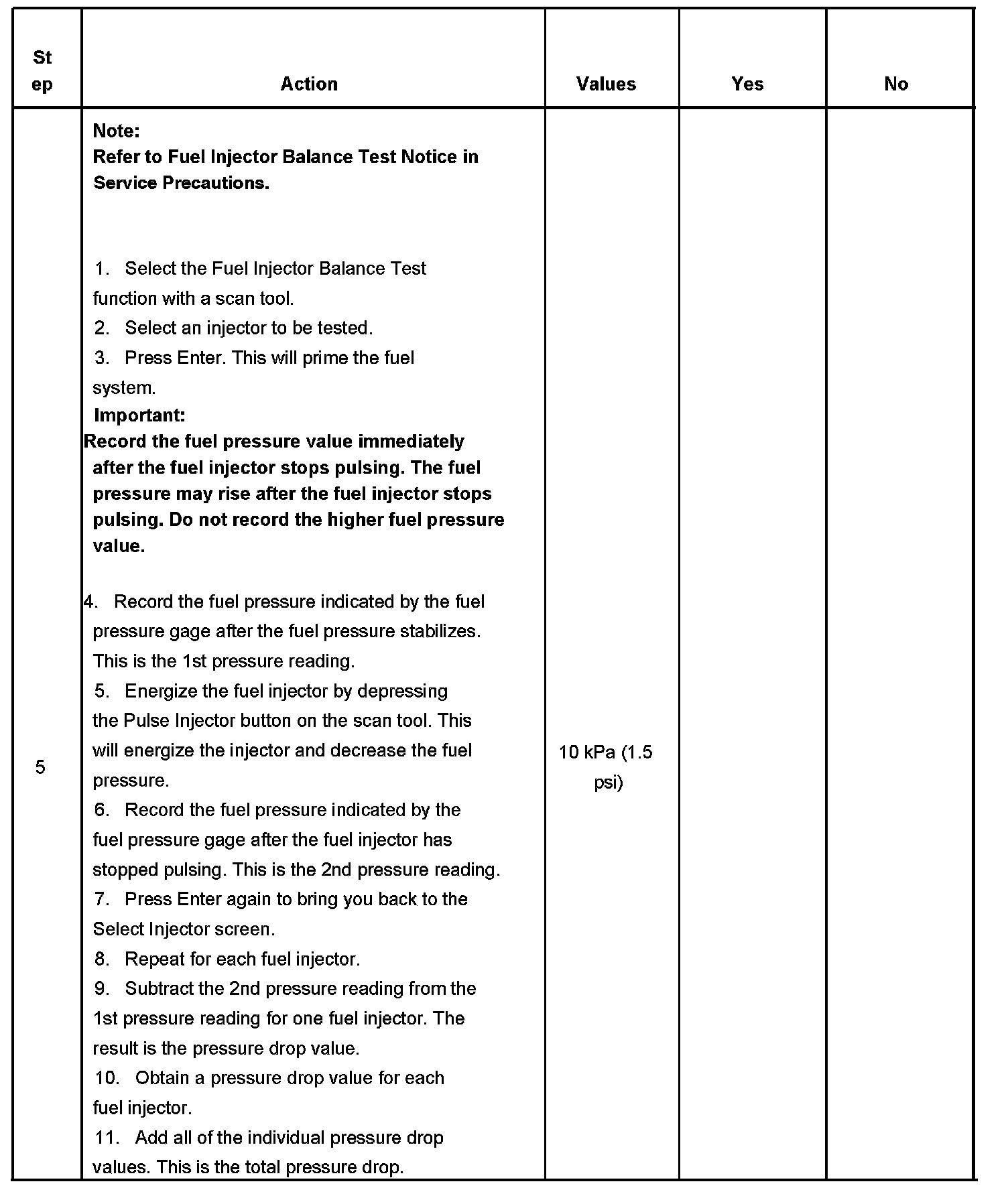 5. If the pressure drop value for each fuel injector is within 10 kPa (1.5 psi) of the average pressure drop value, the fuel injectors are flowing properly. Calculate the pressure drop value for each fuel injector by subtracting the second pressure reading from the first pressure reading.