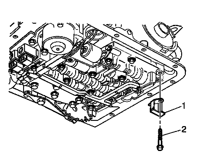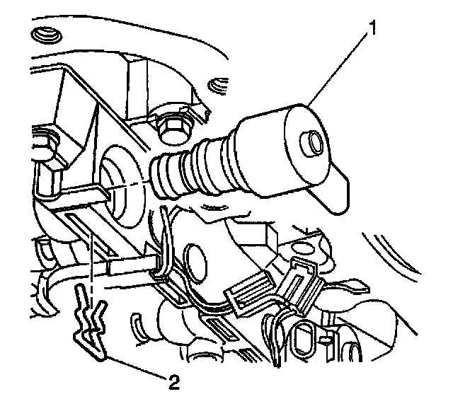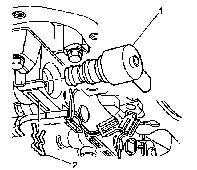 8. Remove the TCC PWM solenoid retainer (2) with a small screwdriver. Rotate the solenoid (1) in the bore, if necessary, until the flat part of the retainer (2) is visible.