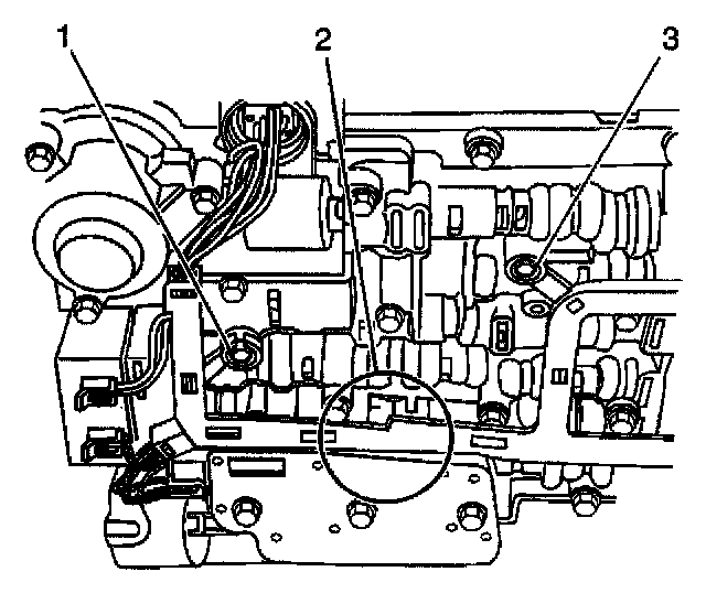 3. Verify that the manual valve link (3) is installed properly to the inside detent lever (1) and the manual valve (2).