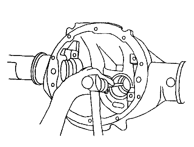 7. Remove the outer pinion bearing cup from the axle housing using a hammer and a brass drift in the slots provided. Move the drift back and forth between one side of the cup and the other in order to work the cups out of the housing evenly.