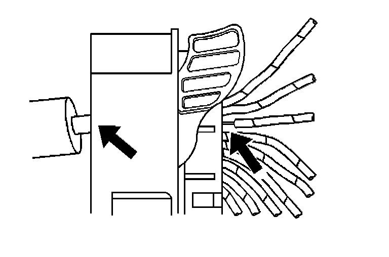 7. Insert the J 38125-13A (GM P/N 12031876-1) tool into the round canal between the terminals cavities at the front of the connector. See the release tool cross reference in the Reference Guide of the Terminal Repair Kit to ensure that the correct release tool is used.