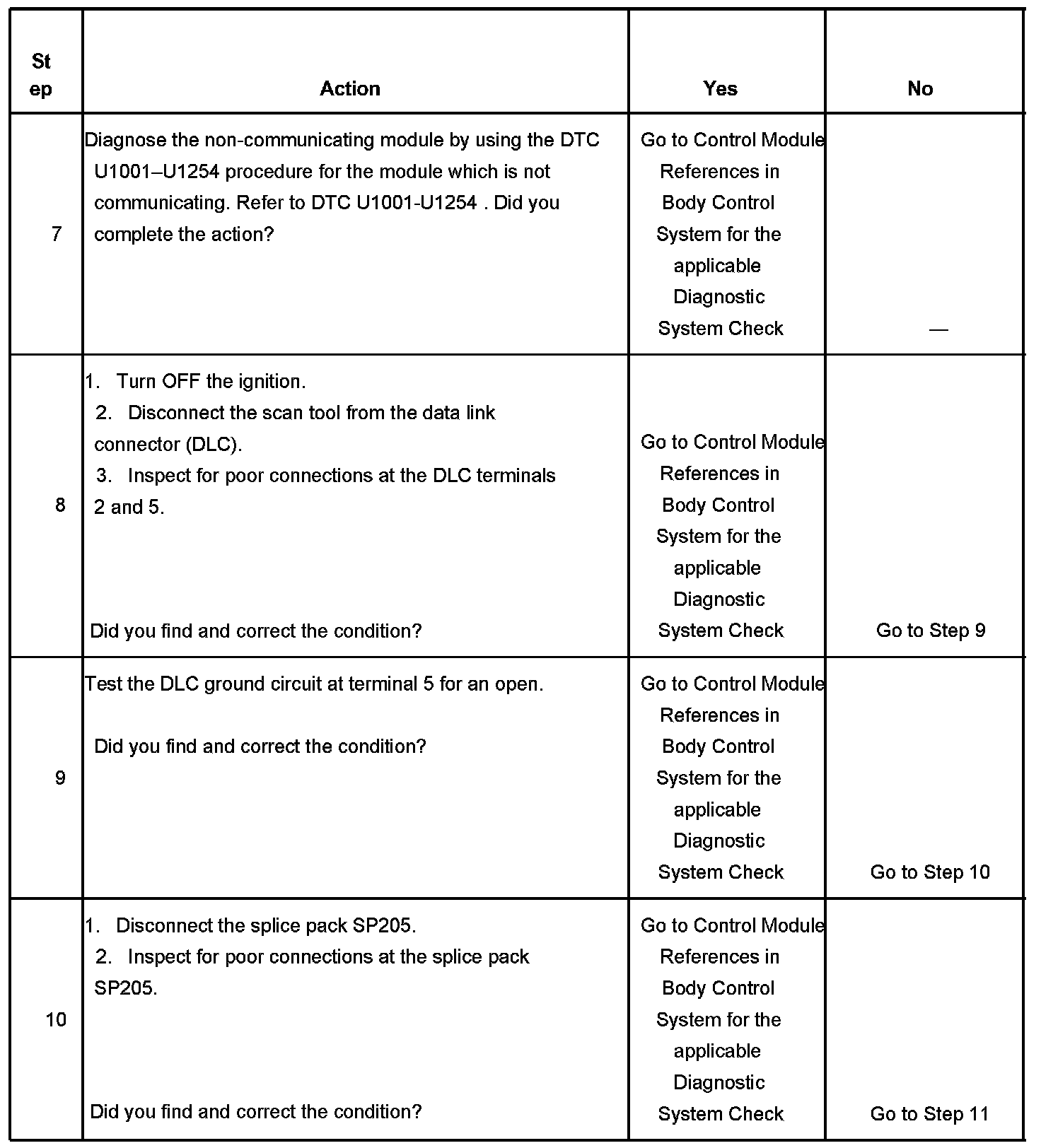 10. A poor connection at DLC terminal of the splice pack SP205 would cause this condition but will not set a DTC.