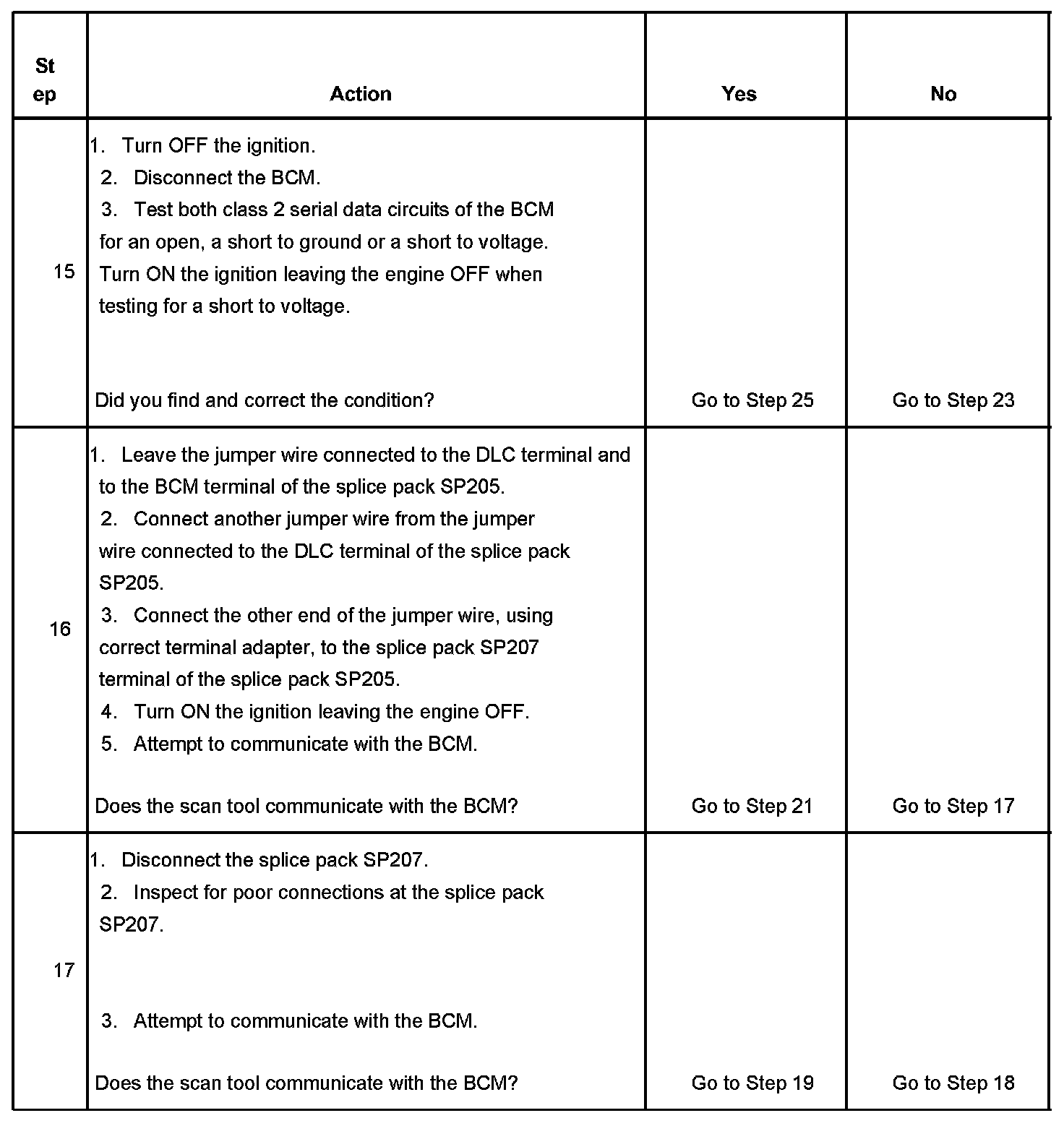 16. The BCM detects that the ignition is ON and sends the appropriate power mode message to the other modules. Therefore, the BCM must remain connected to the DLC for any other module to communicate with the scan tool. This test isolates the splice pack SP207 serial data circuits.
