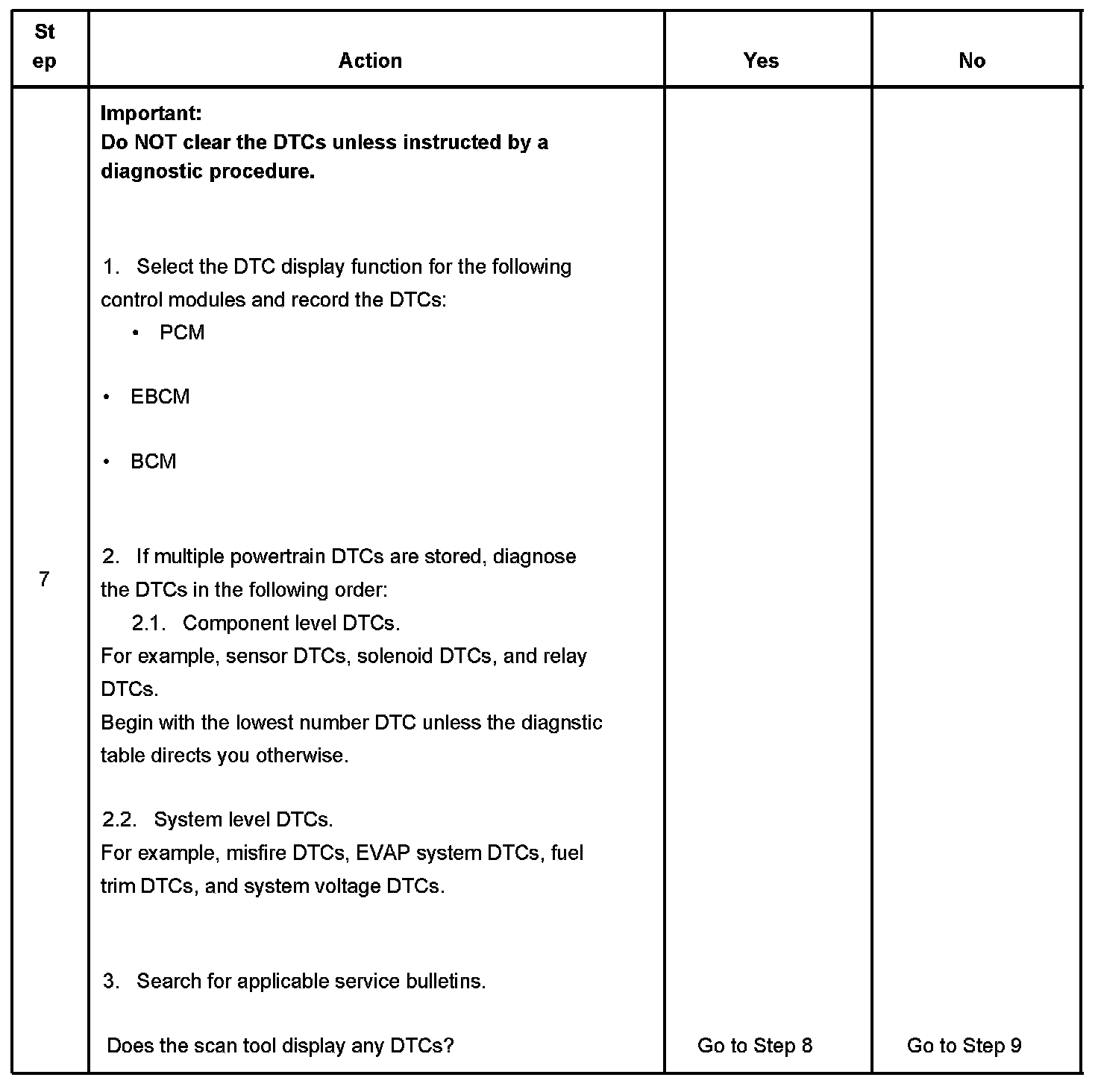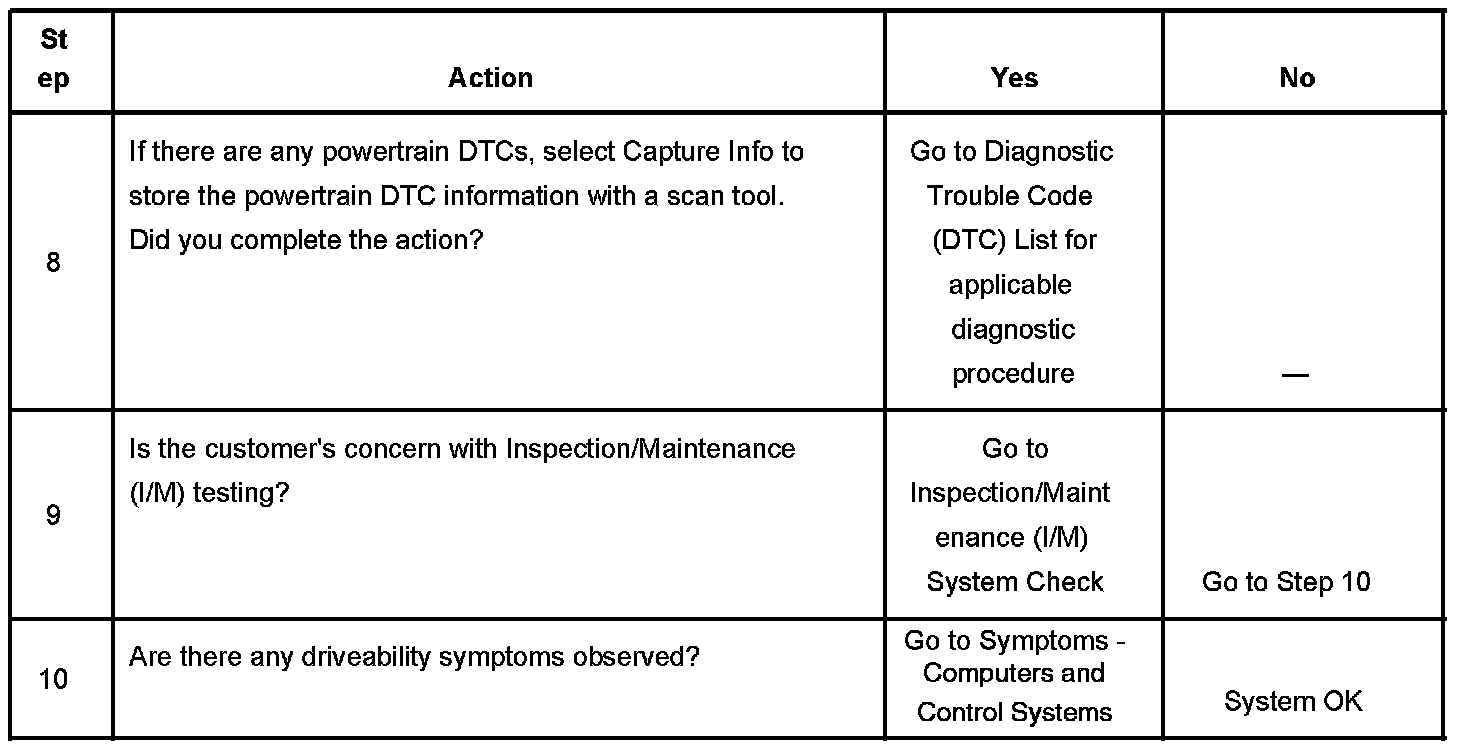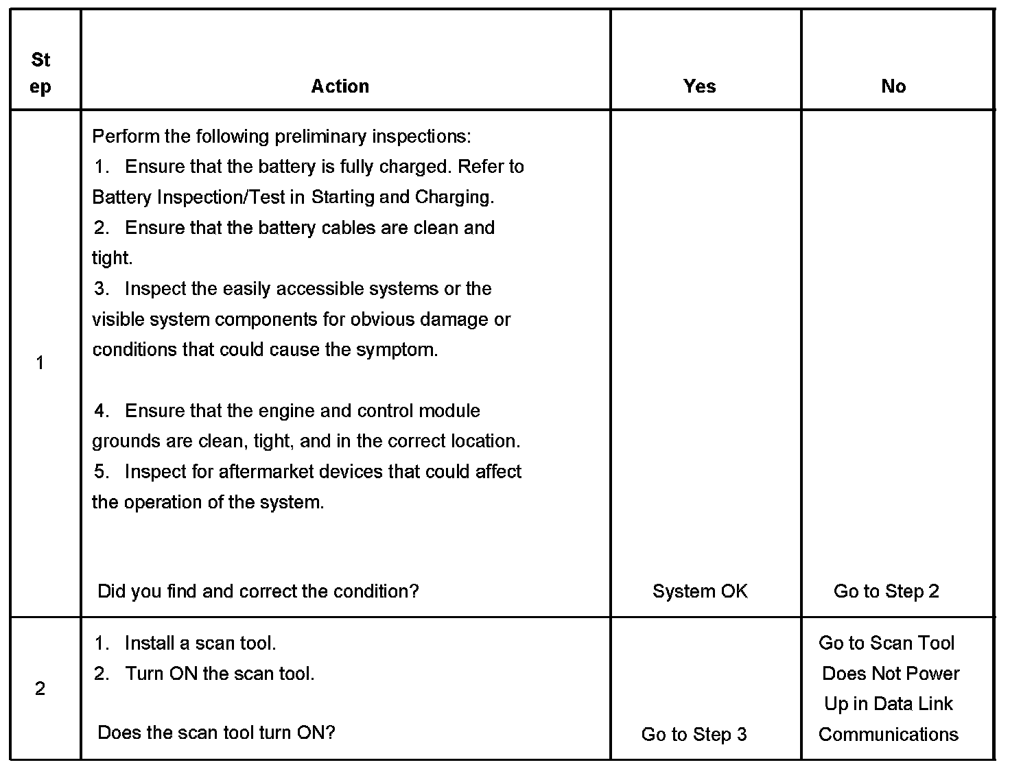 The Diagnostic System Check is an organized approach to identifying a condition created by an electronic engine control system malfunction. The Diagnostic System Check must be the starting point for any driveability concern. The Diagnostic System Check directs the service technician to the next logical step in diagnosing the concern. Understanding the table and using the table correctly reduces diagnostic time and prevents the replacement of good parts.